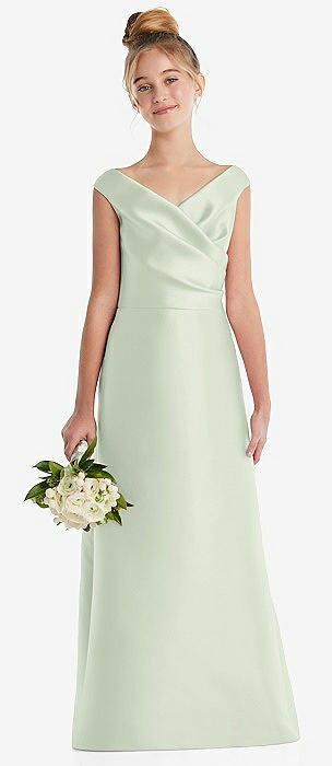 Off-the-Shoulder Draped Wrap Satin Junior Bridesmaid Dress in mint green