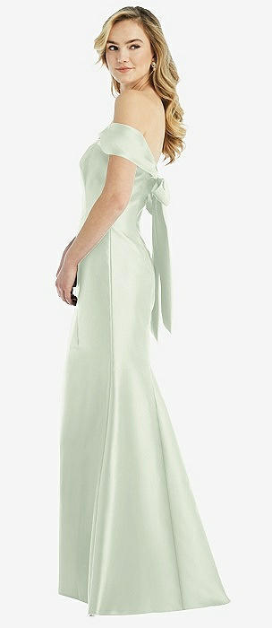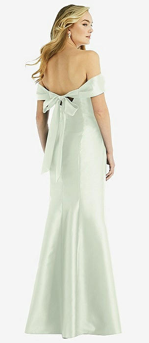 Off-the-Shoulder Bow-Back Satin Trumpet Gown in mint green