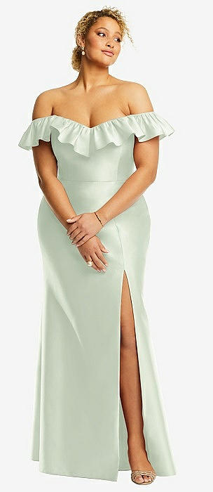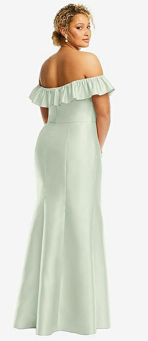 Off-the-Shoulder Ruffle Neck Satin Trumpet Gown in mint green