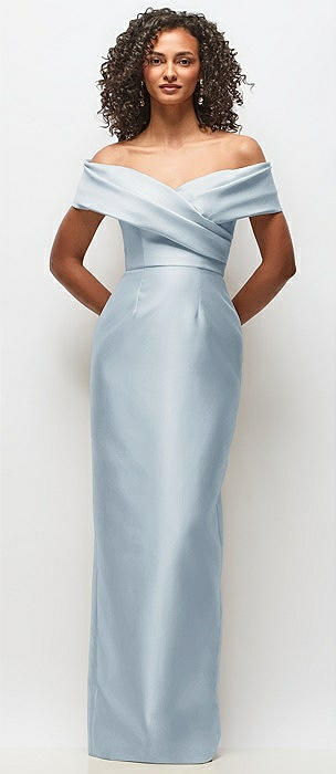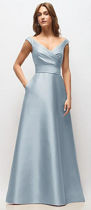 Off-the-Shoulder Draped Wrap Satin Maxi Dress in mist