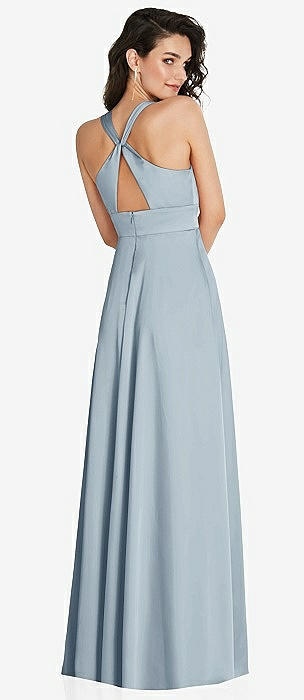 Stand Collar Halter Maxi Dress with Criss Cross Open-Back in mist