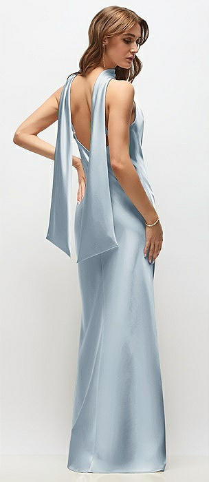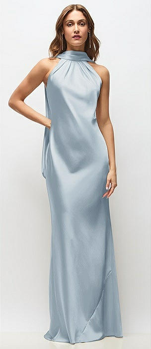 Draped Scarf Halter Open-Back Stretch Satin Bias Maxi Dress with Adjustable Straps in mist