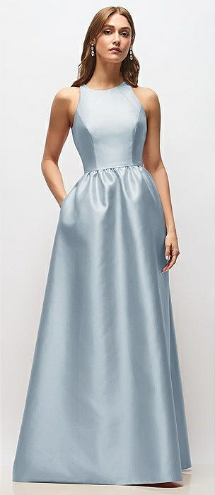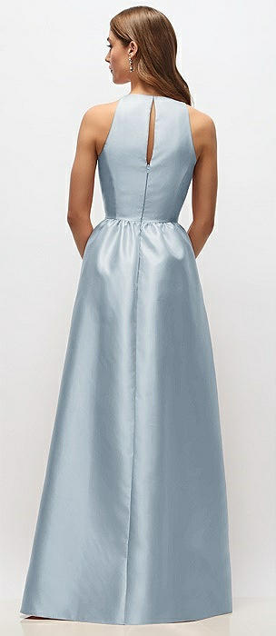 Jewel Neck Halter Full A-Line Satin Maxi Dress in mist