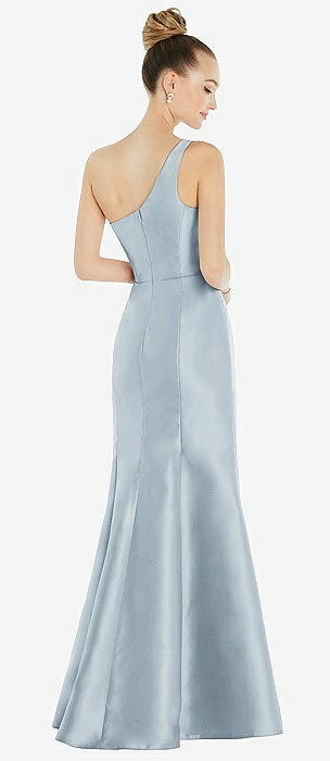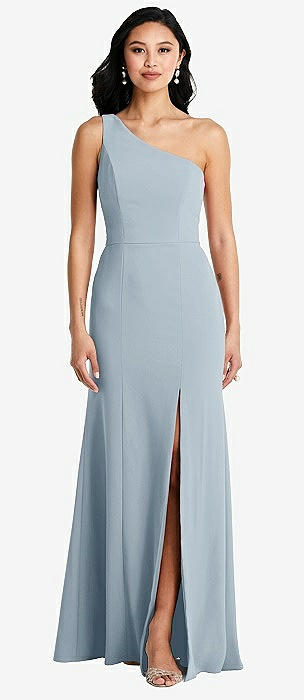 Draped One-Shoulder Satin Trumpet Gown with Front Slit in mist