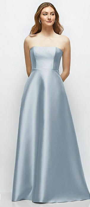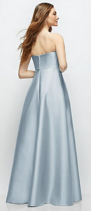 Strapless Satin Gown with Full Skirt and Covered Buttons at Back in mist