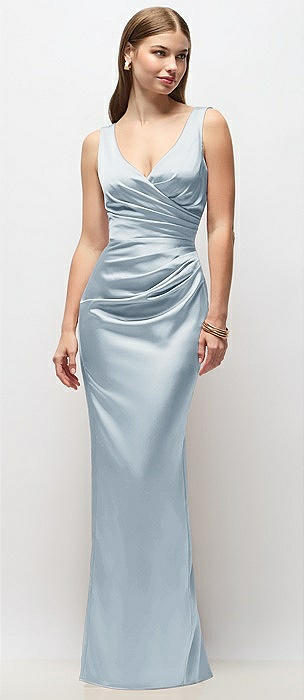 Sleeveless Draped Wrap Bodice Stretch Satin Column Maxi Dress in mist