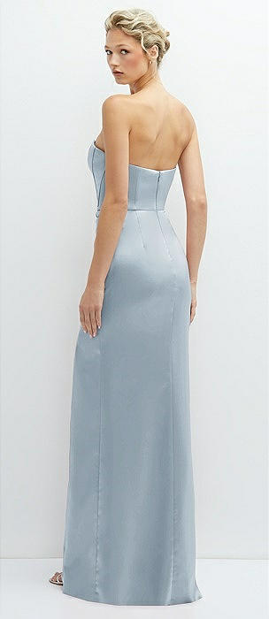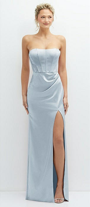 Strapless Topstitched Corset Satin Maxi Dress with Draped Column Skirt in mist