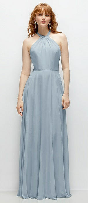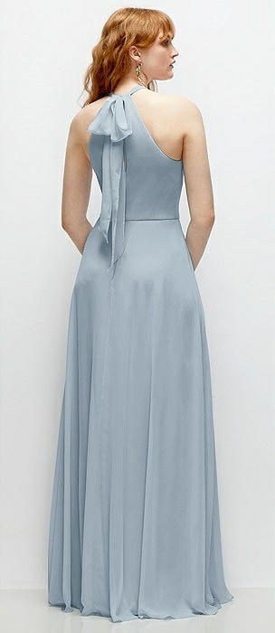 Shirred Halter Chiffon Maxi Dress with Back Sash-Tie Closure in mist