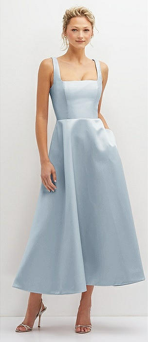Square Neck Satin Midi Dress with Full Skirt & Pockets in mist