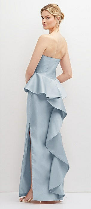 Strapless Satin Maxi Dress with Cascade Ruffle Peplum Detail in mist