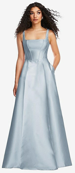 Boned Corset Closed-Back Satin Gown with Full Skirt and Pockets in mist