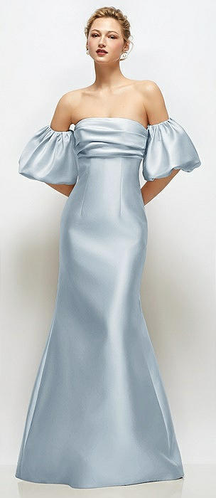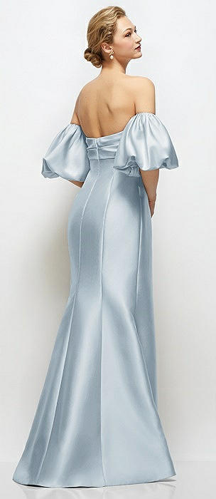 Off-the-Shoulder Puff Sleeve Satin Maxi Dress with Flared Skirt in mist