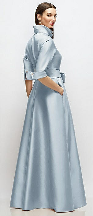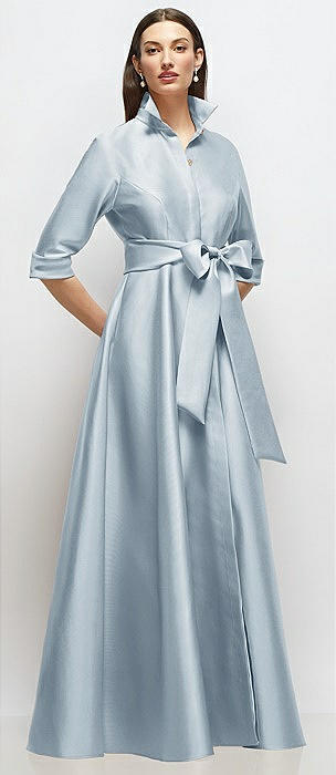3/4 Sleeve Satin Shirt Dress Gown with Sash and Jeweled Buttons in mist