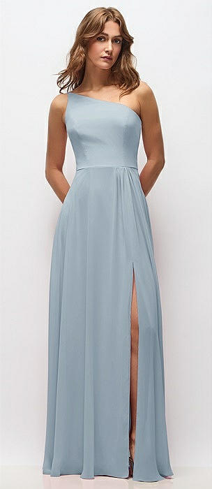 One-Shoulder Chiffon Maxi Dress with Shirred Front Slit in mist