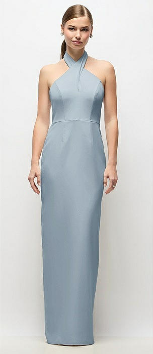 Criss-Cross Halter Open-Back Crepe Column Maxi Dress in mist
