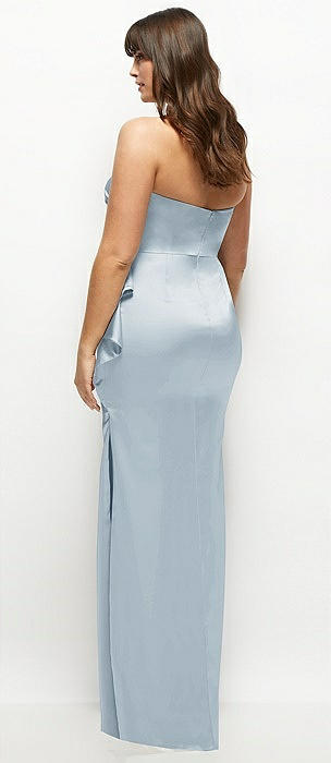 Strapless Draped Skirt Satin Maxi Dress with Cascade Ruffle in mist