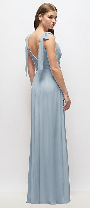 Plunge Neckline Bow Shoulder Empire Waist Chiffon Maxi Dress in mist