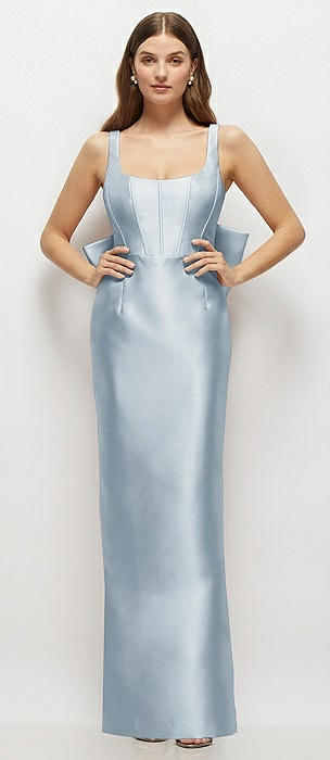 Scoop Neck Corset Satin Maxi Dress with Floor-Length Bow Tails in mist