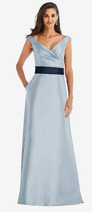 Off-the-Shoulder Draped Wrap Satin Maxi Dress in mist