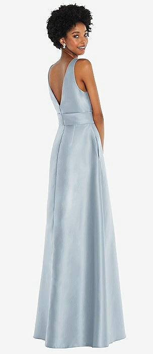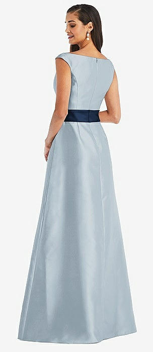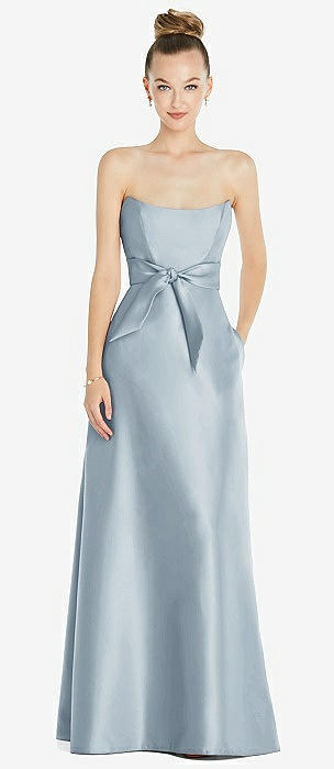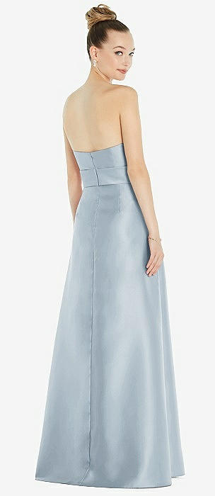 Basque-Neck Strapless Satin Gown with Mini Sash in mist