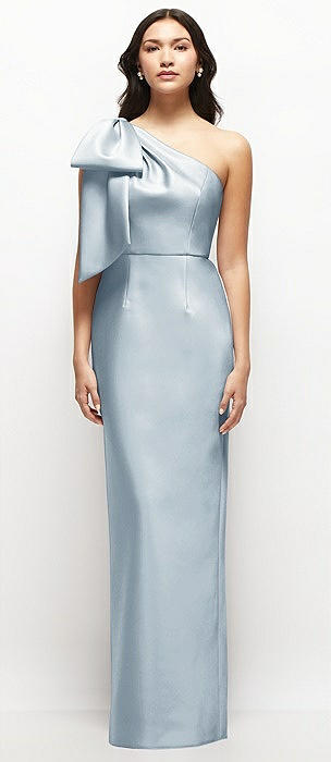 Oversized Bow One-Shoulder Satin Column Maxi Dress in mist