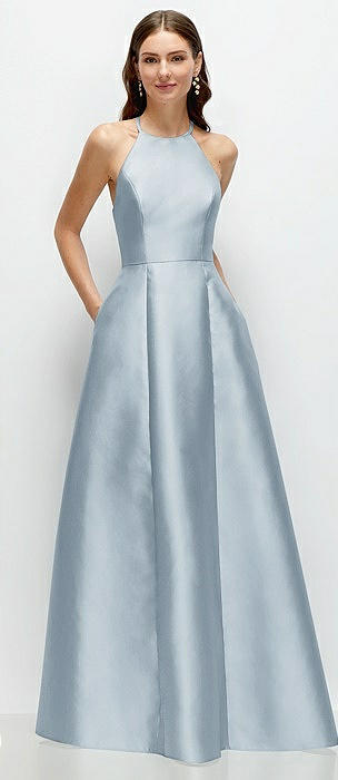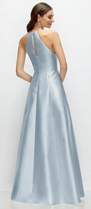 Jewel Neck Halter Full A-Line Satin Maxi Dress in mist