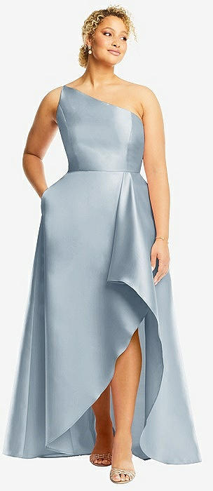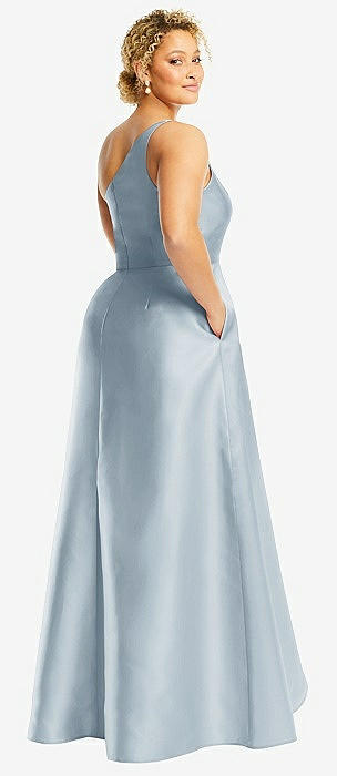 One-Shoulder Satin Gown with Draped Front Slit and Pockets in mist
