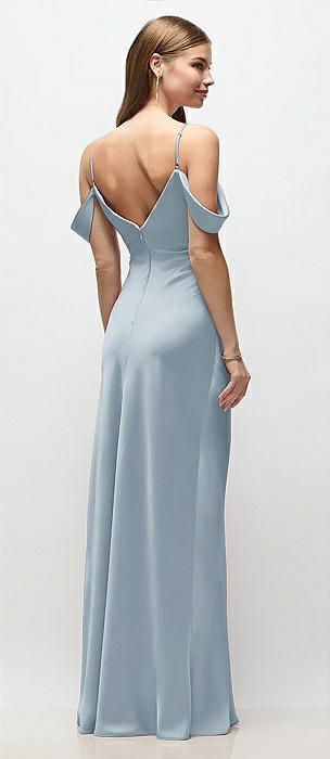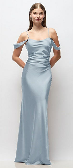 Off-the-Shoulder Swag Ruched Side Satin Bias Maxi Dress with Adjustable Spaghetti Straps in mist