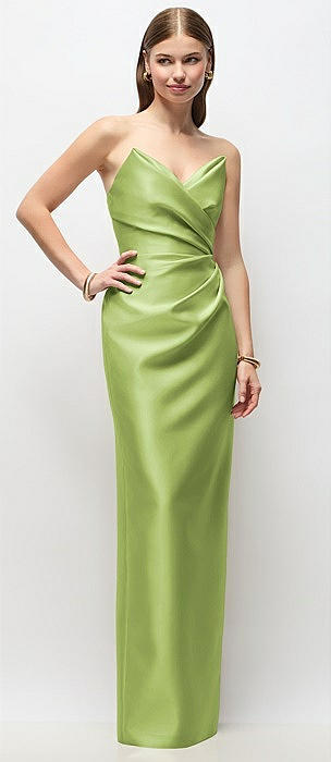 Strapless Asymmetrical Draped Satin Column Maxi Dress in mojito