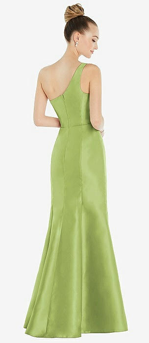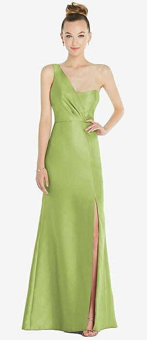 Draped One-Shoulder Satin Trumpet Gown with Front Slit in mojito