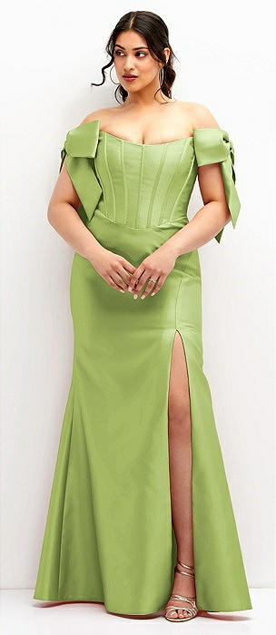 Off-the-Shoulder Bow Satin Corset Dress with Fit and Flare Skirt in mojito