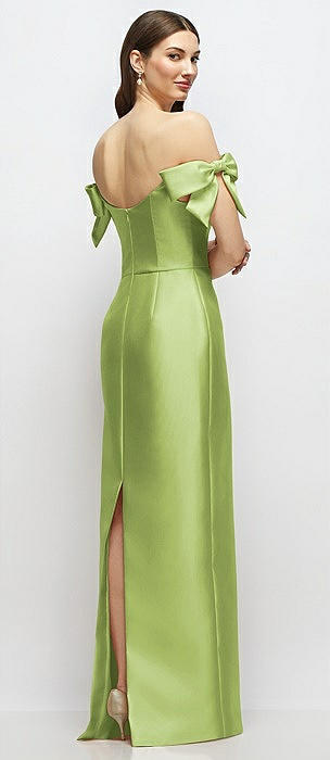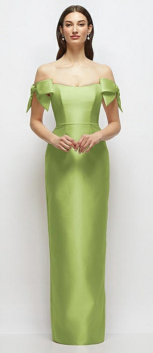 Basque-Neck Satin Column Maxi Dress with Off-the-Shoulder Bows in mojito