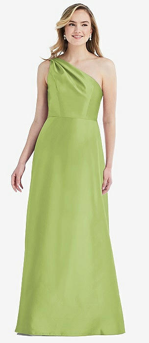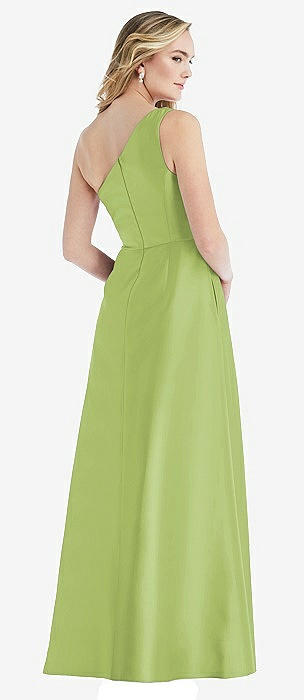 One-Shoulder Satin Gown with Draped Front Slit and Pockets in mojito