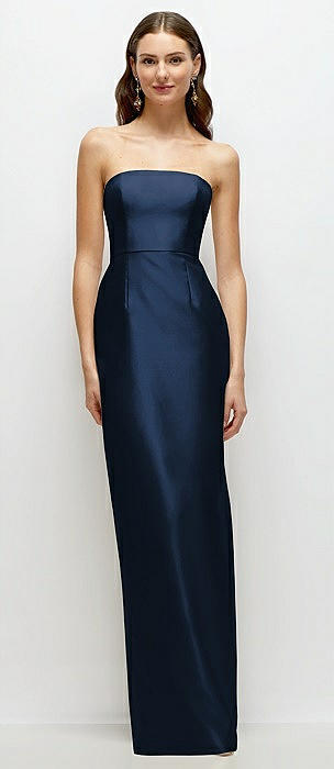 Strapless Satin Column Dress with Back Slit in midnight navy