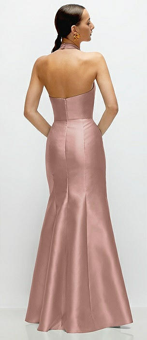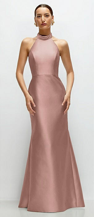 High-Neck Halter Open-Back Satin Trumpet Dress in neu nude