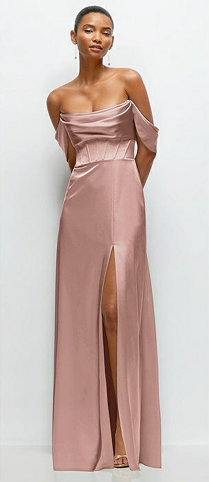Cowl Neck Off-the-Shoulder Stretch Satin Fit and Flare Corset Maxi Dress in neu nude