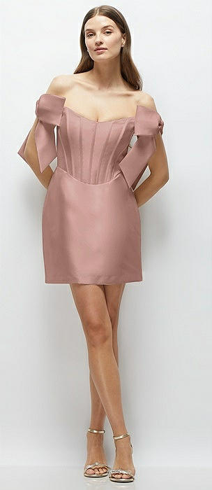 Satin Off-the-Shoulder Bow Corset Fit and Flare Mini Dress in neu nude