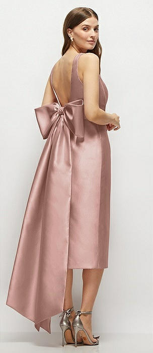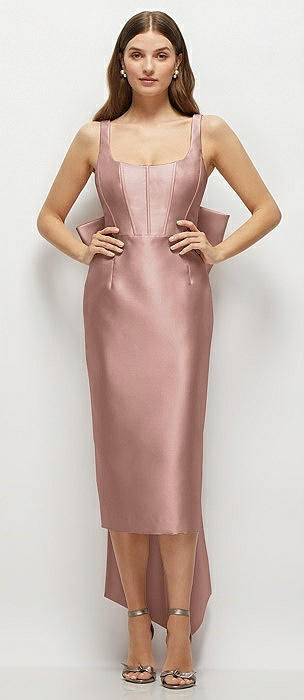Scoop Neck Corset Satin Midi Dress with Floor-Length Bow Tails in neu nude
