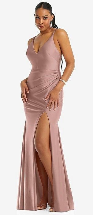 Deep V-Neck Stretch Satin Mermaid Dress with Slight Train in neu nude