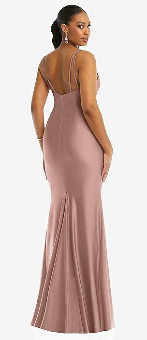 Cowl-Neck Open Tie-Back Stretch Satin Mermaid Dress with Slight Train in neu nude