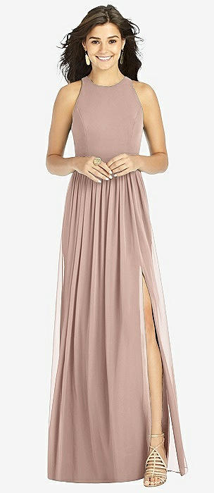 Shirred Skirt Jewel Neck Halter Dress with Front Slit in neu nude
