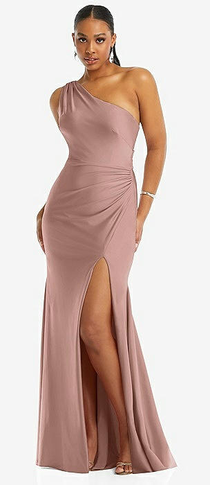 Draped One-Shoulder Satin Trumpet Gown with Front Slit in neu nude