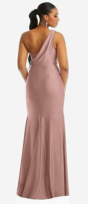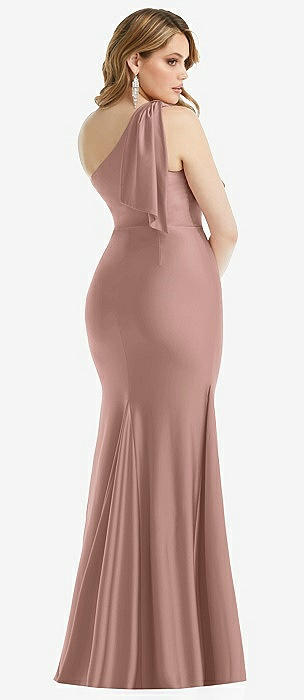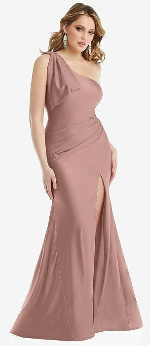 Cascading Bow One-Shoulder Stretch Satin Mermaid Dress with Slight Train in neu nude