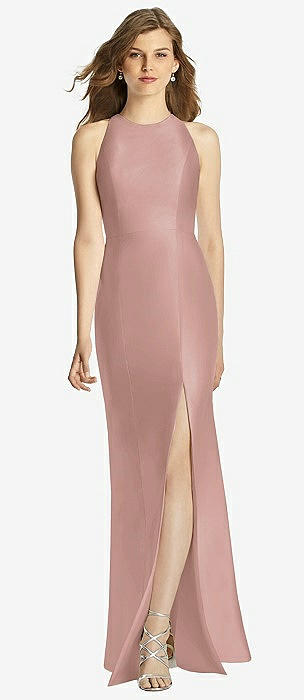 Shirred Skirt Jewel Neck Halter Dress with Front Slit in neu nude
