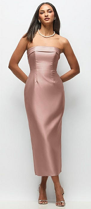 Strapless Cuff Satin Midi Dress with Column Skirt & Back Bow in neu nude