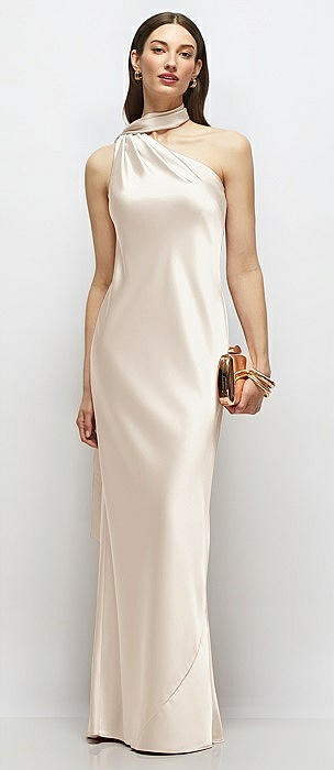 Draped Scarf One-Shoulder Bias Stretch Satin Maxi Dress in oat