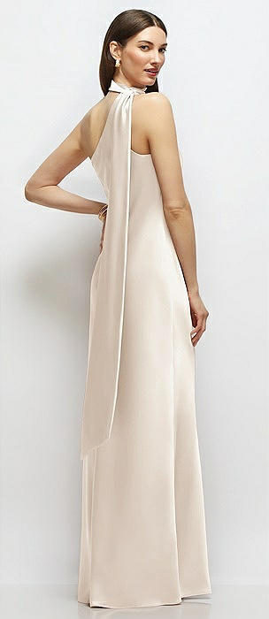 High Halter Tie-Strap Open-Back Satin Maxi Dress in oat