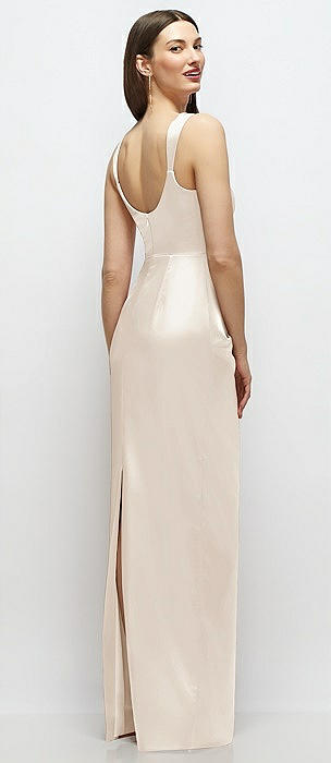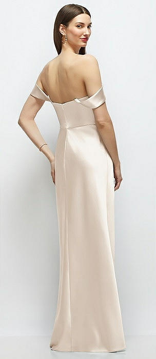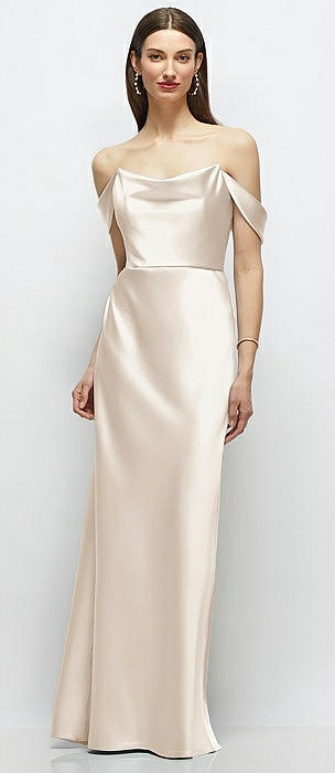 Basque-Neck A-Line Stretch Satin Maxi Dress with Off-the-Shoulder Drape in oat