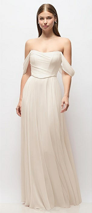 Off-the-Shoulder Basque Corset Chiffon Maxi Dress in oat