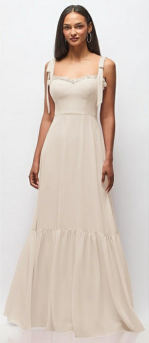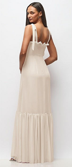 Tie-Shoulder Bustier Bodice Ruffle-Hem Maxi Dress in oat